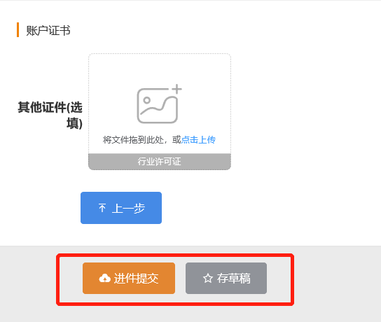 13.账户证书(选填项):针对需要申请微信特约官方通道和支付宝官方通道的餐饮商户,请在此处上传《食品经营许可证》或《餐饮服务许可证》照,微信官方通道仅支持个体对公/法人对私,企业对公,餐饮行业默认千6费率;支付宝官方通道,提供未签约当面付的支付宝账号和签约费率;