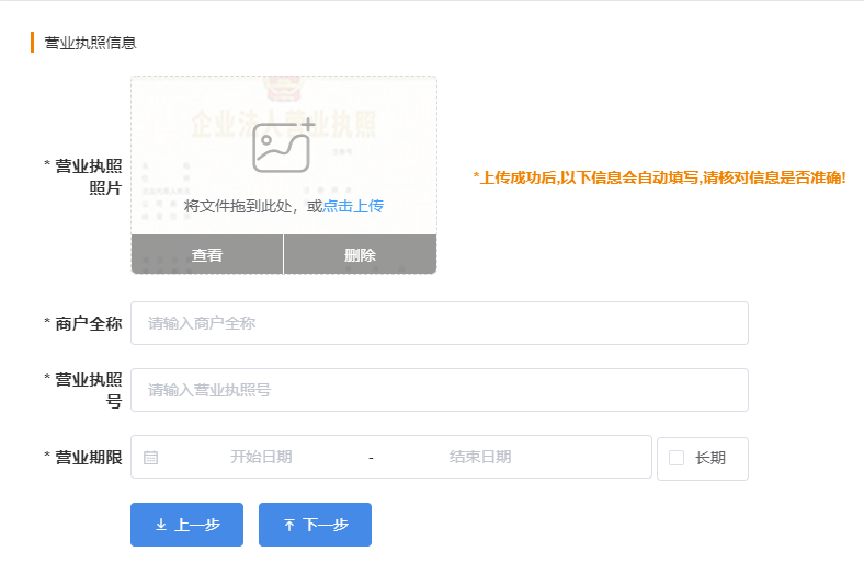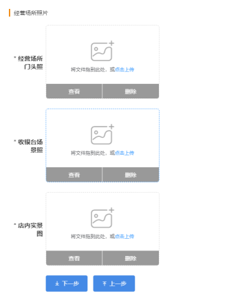 所有照片、证件资料必须真实清晰可辨认且合规,不能是店面摄像头或 PS 处理过的照片。照片不能传错位置,例如:法人身份证正面传正面,反面传反面,不能传错位置。