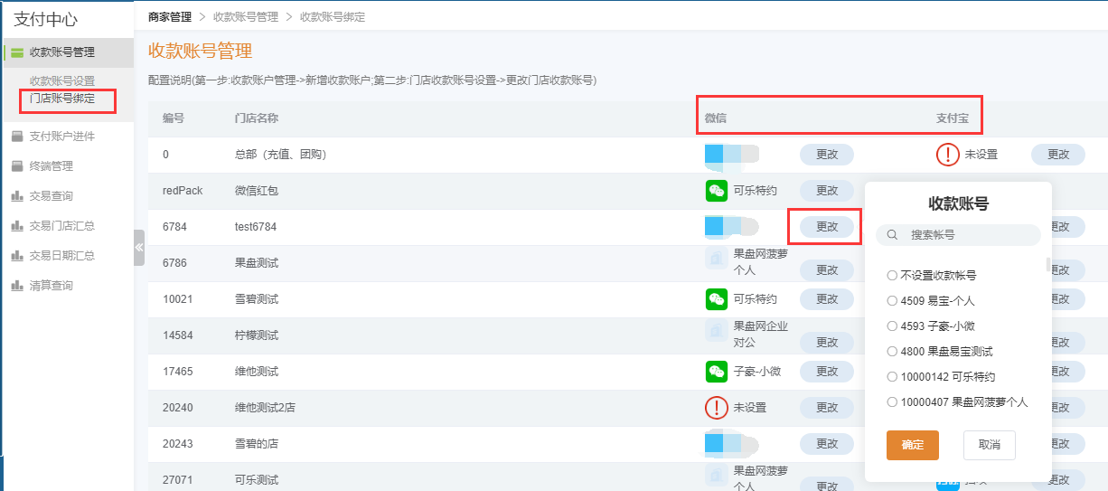 进入“收款账号管理 -->门店账号绑定”点击更改按钮,选择商户完成后,即可开始测试微信和支付宝交易。