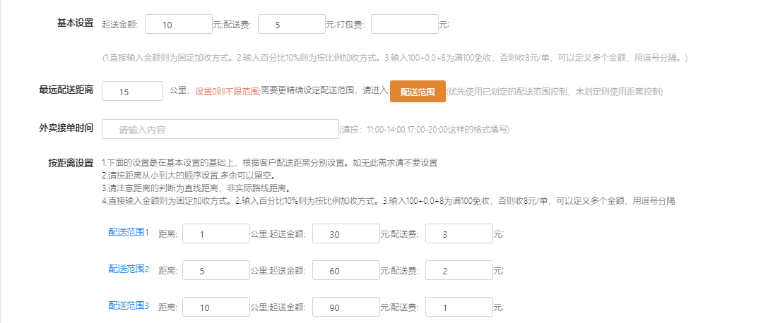 外卖配送范围:点菜模式为外卖时,开启外卖配送范围,商户自行设置配送距离,商户也可以自行划定配送范围(注:门店位置定位准确已确认配送范围的准确性)