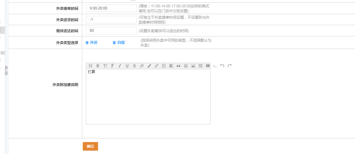 8.外卖送货时间(新增):可独立于外卖接单时间设置,不设置则与外卖接单时间相同