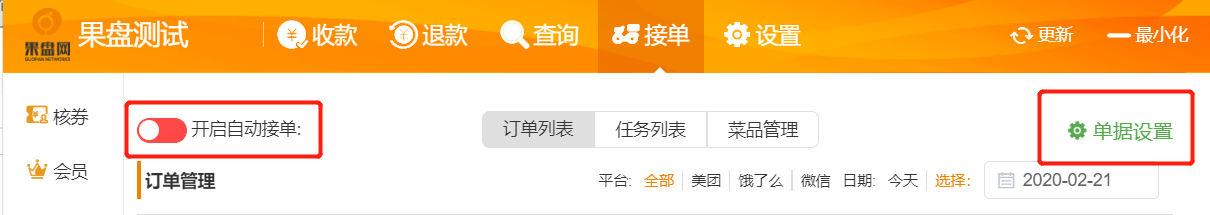 2、打开“接单”,选择是否开启自动接单,进入单据设置。