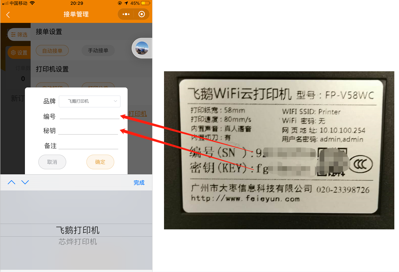3.在果盘后台终端管理中添加终端,选择芯烨打印机,输入相应的参数