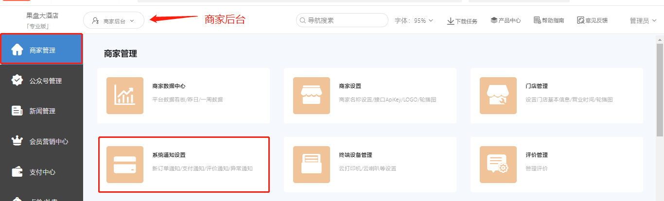 系统通知:发送通知消息给门店用户,目前有预定订单通知、外卖订单通知、线上支付通知、运营日报、结账支付异常告警通知、点菜订单通知、下单异常告警通知、门店营业异常通知。
