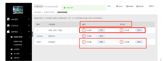 支付中心-门店账号绑定,点击更改按钮,选择商户完成后,即可开始测试微信和支付宝交易。