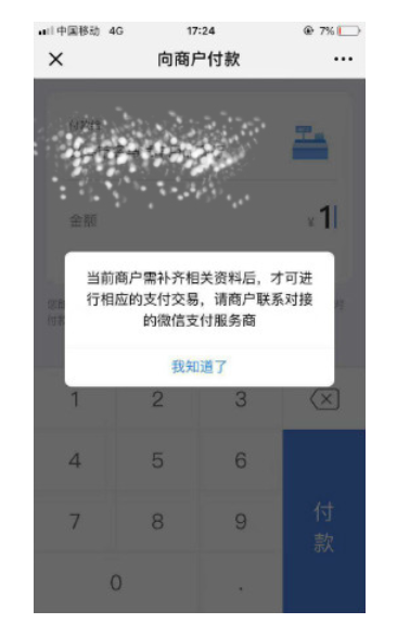 1,当前商户需补齐相关资料后,才可进行相应的支付交易,请商户联系对接的微信支付服务商”。