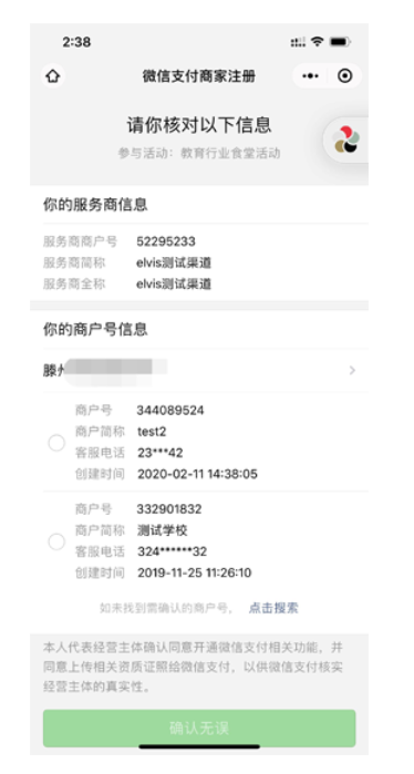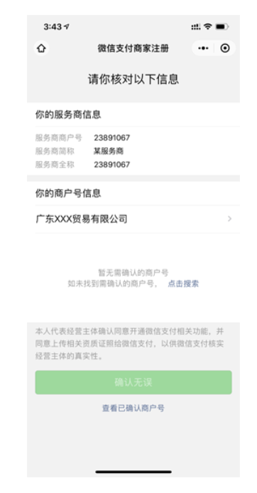 若商户扫码人之前已确认过该主体,再次扫码只需找到对应主体授权微信子商户号(同个营业执照多次进件情况,可分别搜索微信子商户号进行确认,不需要重复注册)