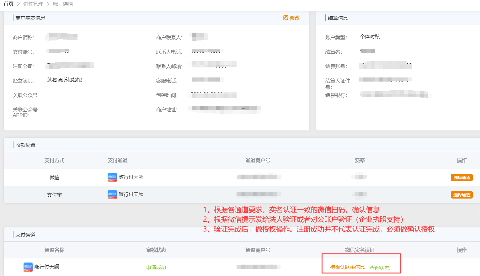 代理商后台-支付进件审核-找到需要认证的商户-账号详情,根据收款账户绑定的通道完成对应的认证