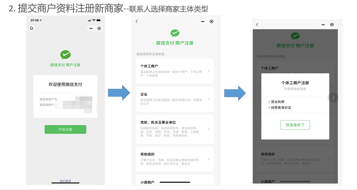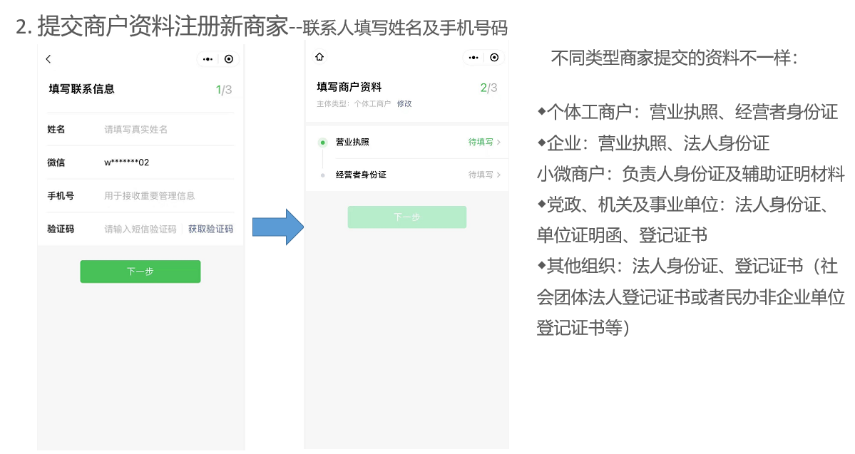 3.2 联系人选择商家主体类型(若商家已经注册,可直接跳到第4步进行门店授权)直接根据微信页面提示一步步操作即可