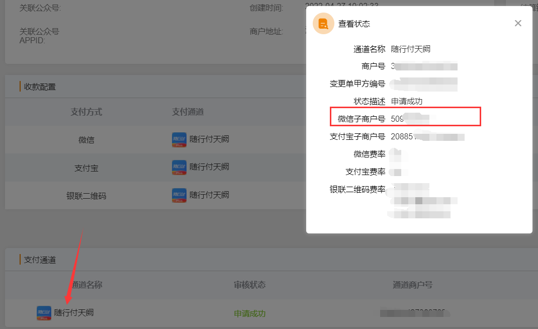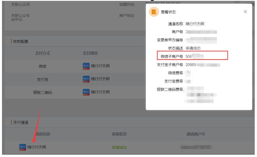 微信子商户号未显示可在后台点击对应通道名称处查询,在进行查找添加确认,见下方示例图