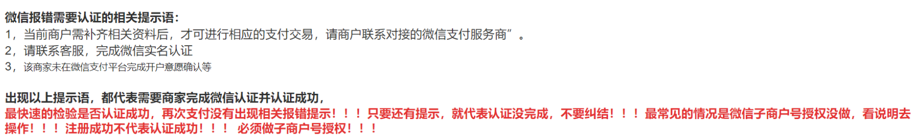 最快速的检验是否认证成功,再次支付没有出现相关报错提示!!!只要还有提示,就代表认证没完成,不要纠结!!!最常见的情况是微信子商户号授权没做,看说明去操作!!!注册成功不代表认证成功!!! 必须做子商户号授权!!!