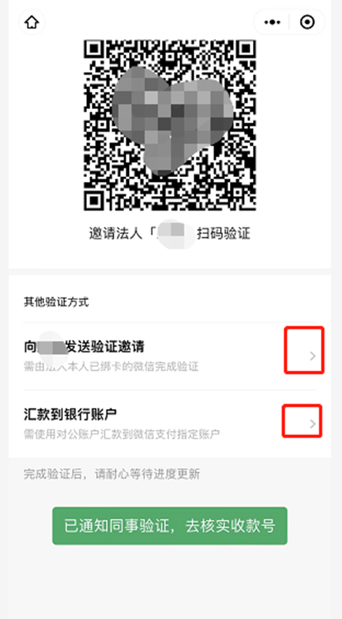①验证方式:邀请法人xx扫码验证,可直接向法人微信发送验证邀请或直接扫微信界面的二维码扫码验证。