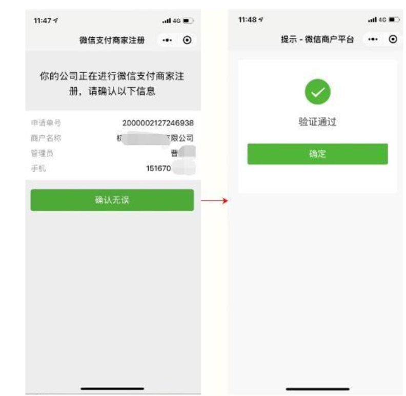 第一步:核实商家身份,确认信息无误(手机号可直接修改),根据微信界面提示发给法人验证或对公打款(注:打款验证仅限于企业、民办非企业单位类型商户,个体工商户、小微商户类型只能法人验证。)见示例图