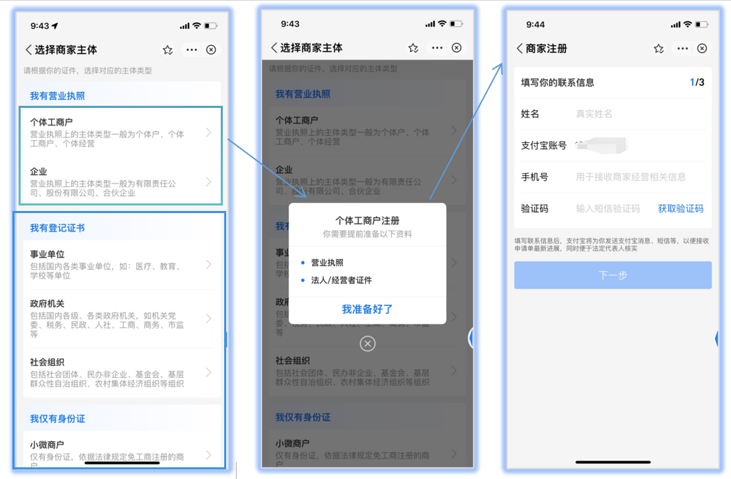 说明:如联系人已有审核通过的商家主体,可直接选择主体进入绑定收款账号smid(支付宝子商户号)的环节。
