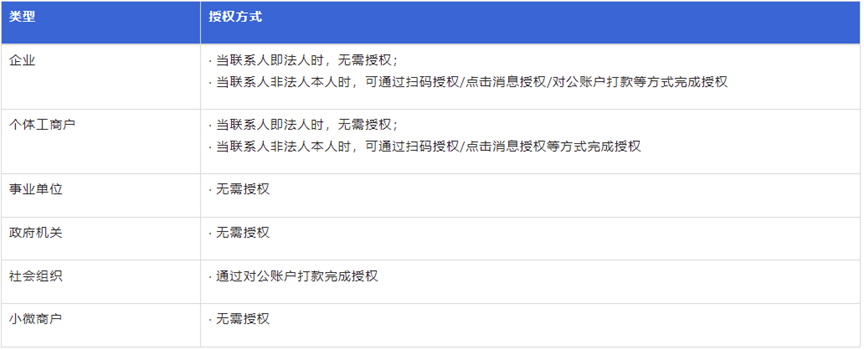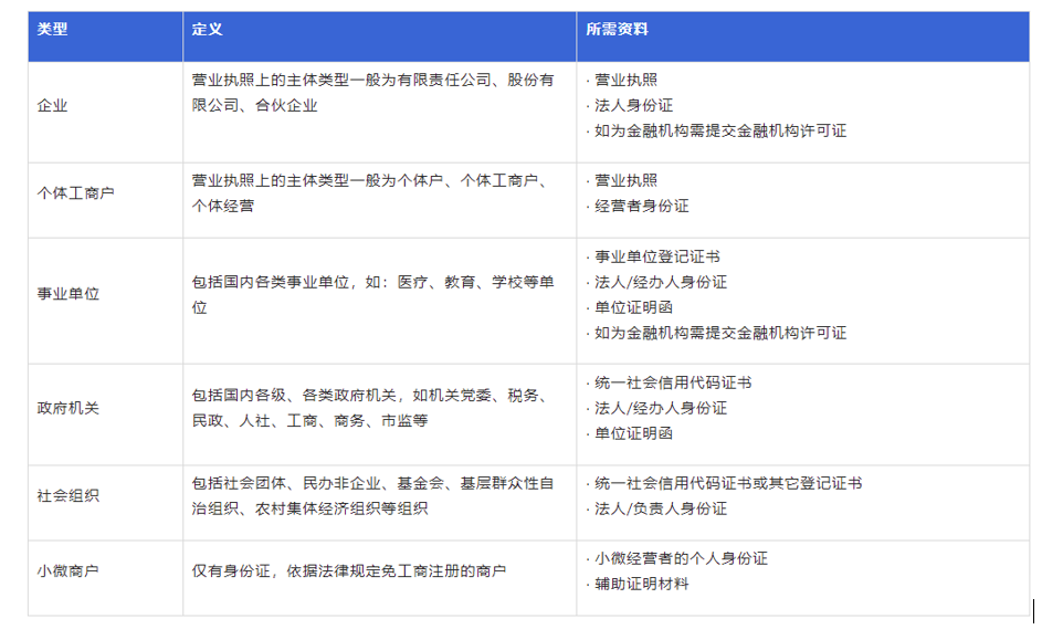 A2:目前支持个体工商户、企业、政府机关、事业单位、社会组织、小微商家等类型。
