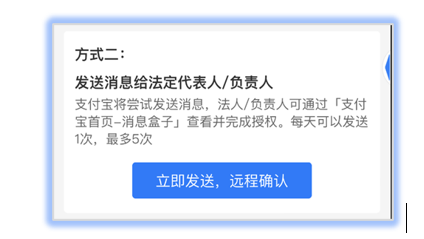 方式二:通过支付宝发送消息通知法人,法人使用已实名认证的支付宝账号完成授权确认