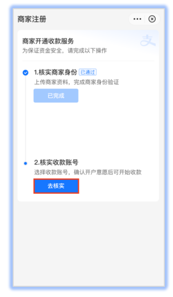 A1:联系人扫线下拓展码,提交商家资料后完成法人授权或完成公账打款验证,并完成收款账号绑定,即可完成认证。