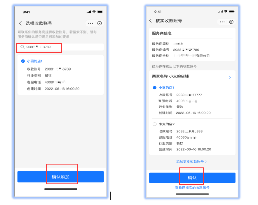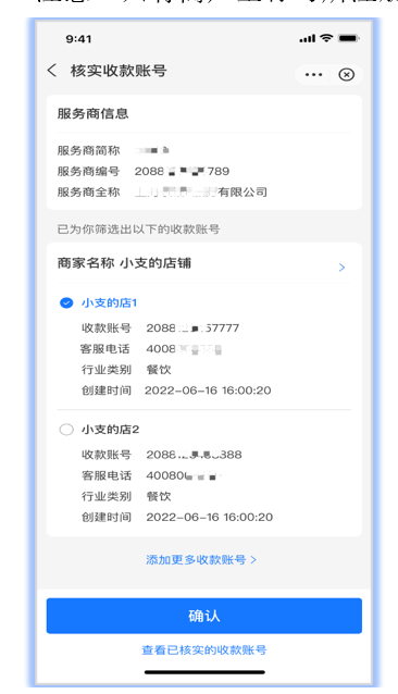 A8:联系人扫服务商认证二维码后,收款账号绑定页面会展示该服务商下申请的未授权的同名门店的收款账号(支付宝子商户号)。商家也可以联系代理商在后台查询支付宝子商户号。