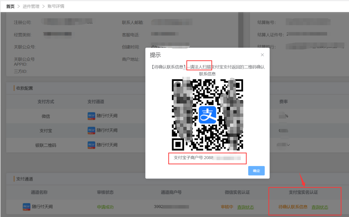 3,法人核实收款账户(支付宝子商户号,可在后台查询,二维码界面也有显示)