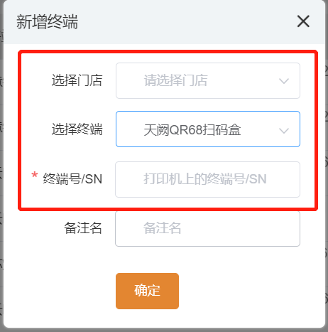 机器关联到门店操作步骤:商家后台-终端管理-新增终端-选择门店-选择天阙QR68扫码盒-输入TUSN 码(5 个 0 开头的)-确定