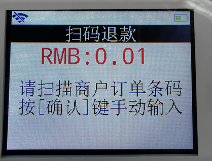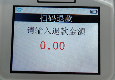 功能介绍:退款用户出示退款二维码或商户手动输入退款订单号,即可进行退款。