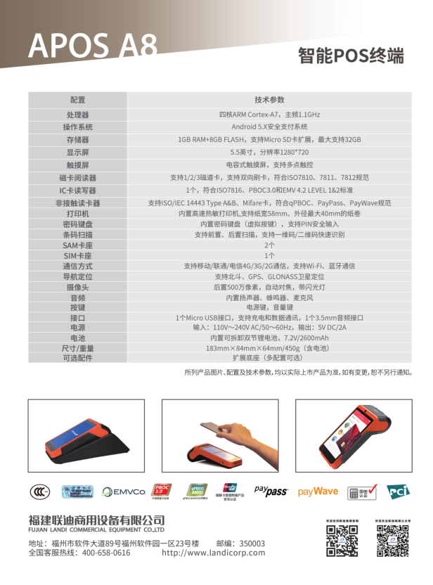 800/台,运费到付,流量卡(pos专用物联网卡)、小票纸需自行采购,上游不提供;后期若换商户使用,需重新邮寄至苏州总部灌装秘钥。